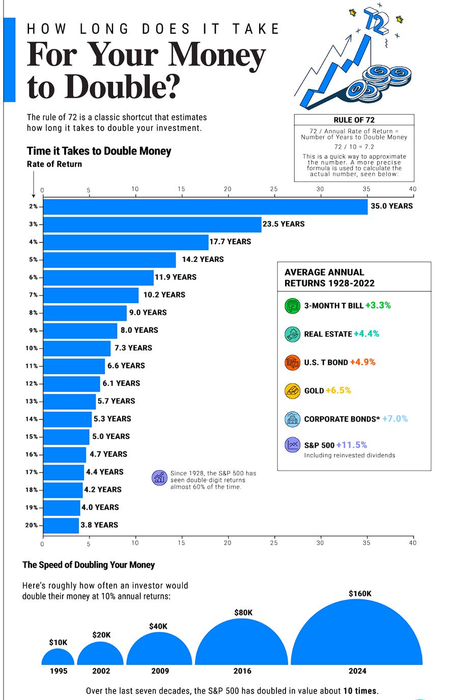 The rule of 72 is a great mental tool that a lot of non-financial people aren’t aware of. It’s something I’ve used repeatedly when thinking about investment returns. Here’s a neat graph laying out the concept with some additional info on long term returns of different assets.